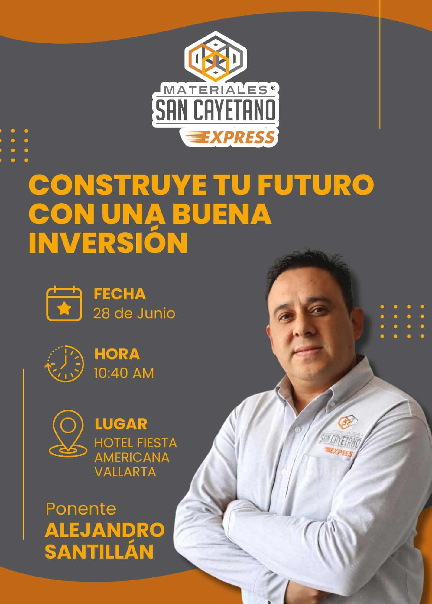En este marco, Materiales San Cayetano Express®  presenta la ponencia “Construye tu futuro con una buena inversión”, impartida por el Lic. Alejandro Santillán, Gerente Comercial. Esta se realizará el próximo 28 de junio a las 10:40 am en el Salón Vallarta 1 y 2 del Hotel Fiesta Americana Vallarta, en Puerto Vallarta, Jalisco.